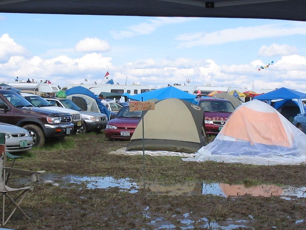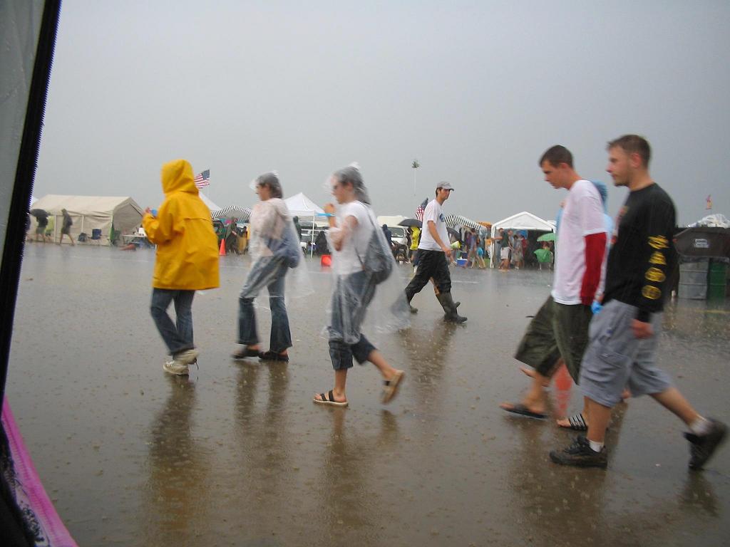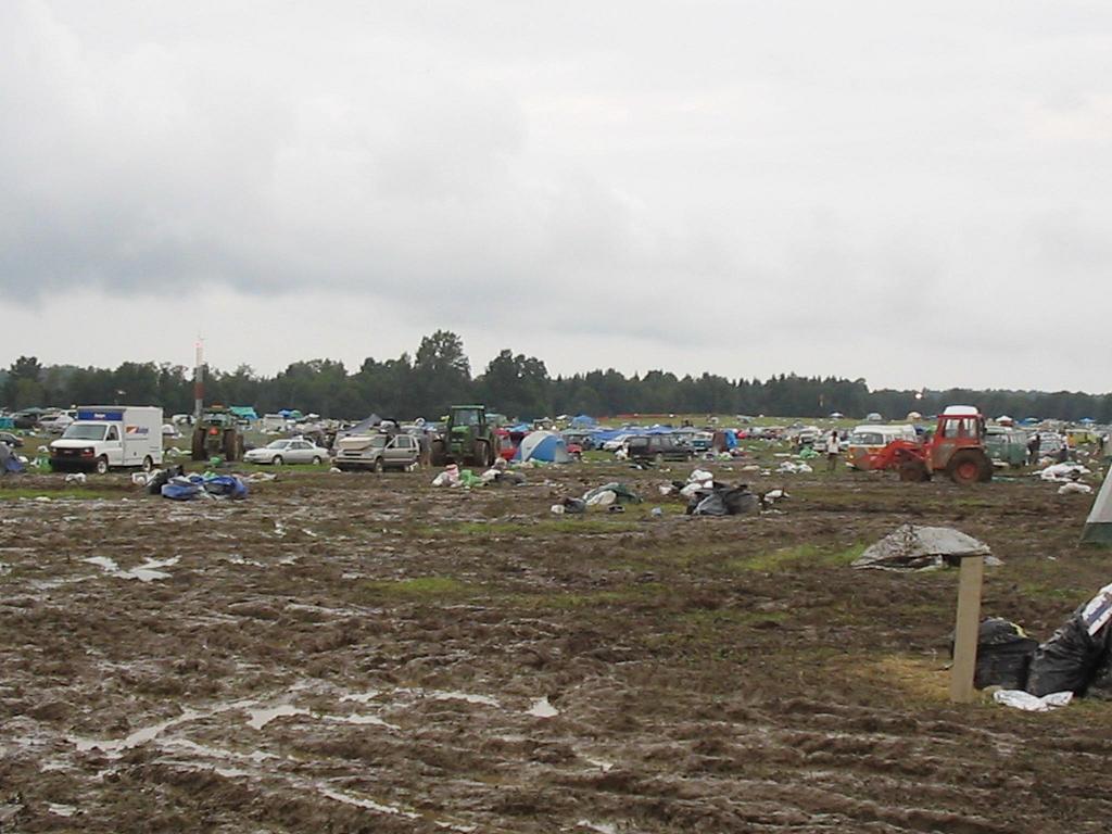 We spent most of the day at Susan's friends' camp, since they had dry seats and we could just observe the rain from there instead of having to deal with it. By this time, I was wearing Susan's flip-flops w/ my jeans rolled up as high as they could go, despite the fact that they're 2 sizes too big for me and kept getting stuck in the mud, just so my feet could dry off whenever I was sitting down for a while. The rest of the day was an attempt to get/stay dry and to find more people Susan and Libby knew. I saw some pusher kid wearing plastic bags w/ duct tape over his socks and inside his shoes and I was so sick of being wet and cold (already) that I immediately set out to do the same for myself. It worked pretty decently. After 8 hours of walking in mud and water, some water did seep into my socks, but not enough to fret about and at least it wasn't muddy water. We were drinking beer most of the day and night (well, I was nursing mine in an attempt to not get shit-faced after not sleeping for over a day), which is probably why I wasn't that hungry and only ate chips. Finally, well after nightfall and the big mobile stadium lights came on, I was incredibly tired and had to go back to the truck to sleep. There was no way the tent was going to work anymore since the ground was so wet. I had wanted to go to the General Store in the Common Area earlier in the day to check if they had rainboots, but didn't since I'd figured such a thing was too good to be true, but since Susan and Libby weren't ready to turn in yet, I went to the General Store in a daze and the vague hope of finding feet protection. Turns out they did have rubber boots earlier in the day, but by that time, they only had childrens' sizes left, which were too small for even me. I did buy the last pair of size 6 rubber shoes and a tarp for... whatever we'd need it for. Getting my garbage-bag socks off was incredibly difficult since I was so amazingly tired and weak and I didn't have anything to cut the tape with besides my keys... and I was trying to avoid getting mud all over Libby's car and myself; which we eventually accepted as impossible. I finally got them off, washed my hands w/ bottled water and contact lens solution as best I could, took out my lenses (you really have to when you've been wearing the normal kind for over 36 hours), rolled up my pants further so as to not get mud on the seat of the car, wrapped a shirt around my eyes (to block out the light from the mobile stadium lights), and took a Benedryl (to assure sleep despite the techno and Phish music that seemed to be coming from everywhere). During this entire process, I was trying to call Aaron at home (everyone was roaming on the same system so it was hard to get a signal), but he wasn't there when I finally got through, and I must've left the most incoherent, rambling, sad-sounding message ever.