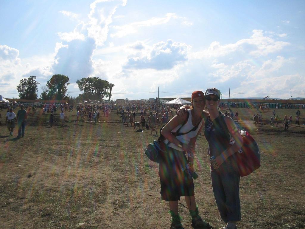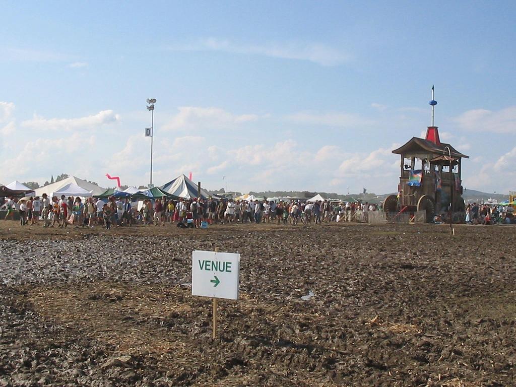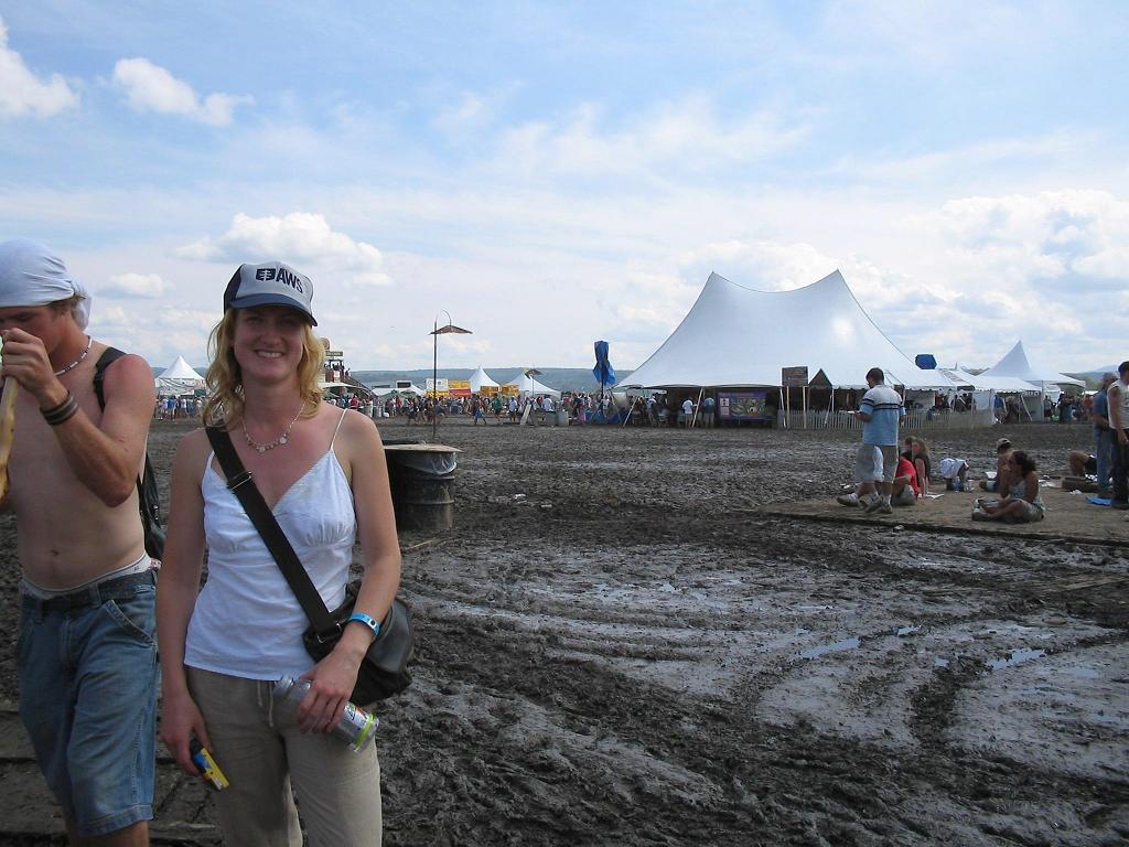 When we finally got to the place where your car was to get searched and you got cool wristbands in exchange for your tickets (for entry into the actual concert venue Saturday and Sunday), we were barely searched but we saw some other people really getting it. It was 5:45am by the time we got in the final line that was to take us where we were to park/camp. I tried to get pictures of how amazingly massive the fields were (I'll try to scan and post the map of the area we were given sometimes soon), but it was still too dar to get a good picture. There were two main roads (really runways since it's a small airport) with grassy areas all over, where people were to park/camp. There was a Greek theme for some reason so each grassy area had it's own Greek name (we were in Nectar Rorris). There were also some "access roads" which seem to have been built in the fields to allow better access to the campsites. While these were probably meant for cars, as the weekend got muddier, they became welcomed breaks from walking in the mud to get around. We were parked at our campsite by 6:00am and set up our tent. It had been raining off and on ever since we first got in line and the ground was wet enough that tractors were already pulling people out of the mud and parking them near the runways. Although I had been up for 23 hours, there was no way we were sleeping after the amount of redbull we'd consumed during the night, and it was just too bright and noisey anyway. It was raining, so I took one of the clear garbage bags we were given, tore 3 holes in in and wore it as a rain slicker. It only lasted until that afternoon (when I graduted to using Susan's umbrella). Our first order of business was to get food and coffee, which we found to be reasonably-priced at the "Common Dreams" cafe, which is apparently run by some religious group (shhh... cult) called the Twelve Tribes and one of the girls tried to talk to us about their group. Susan said she was familiar with them since she had studied them as an Anthropology major. After that, we went in search of Susan's friends, who had a sweet, huge awning-like tent in Pythagoras, and their land wasn't as wet as ours since they had been set up since 3am. We all had a beer and relished being dry for the moment, especially since my socks and shoes were immediately soaked and soiled from stepping into some calf-high mud on the way there.