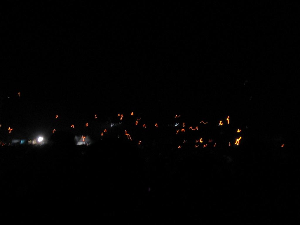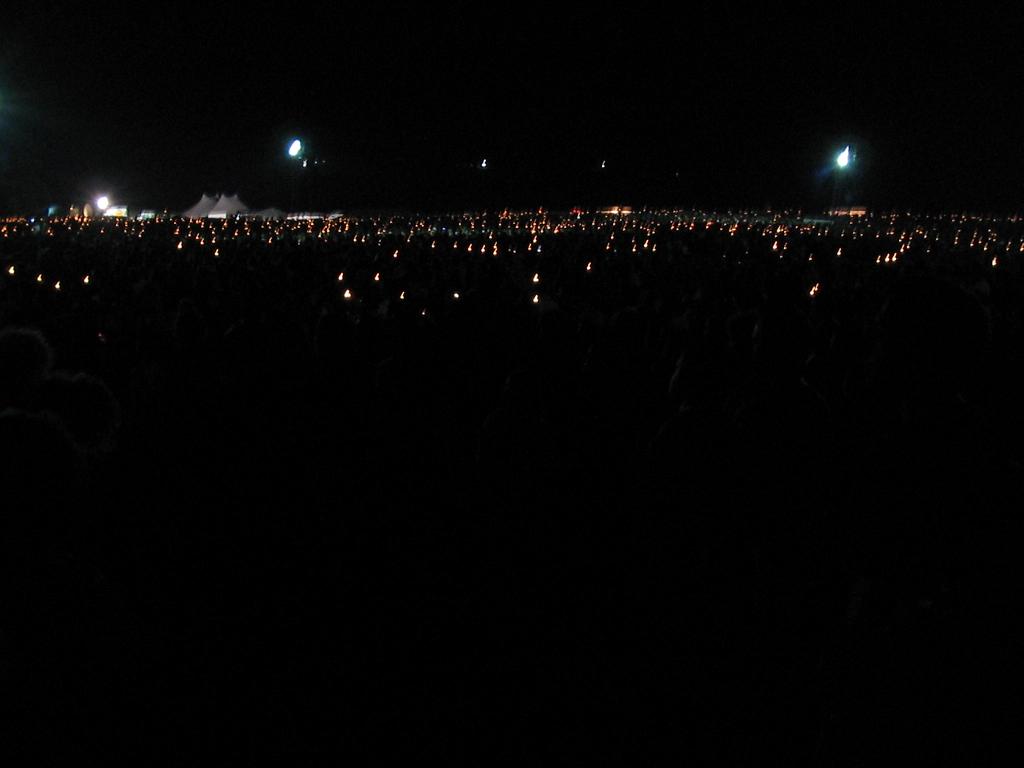 People had been setting fireworks off all weekend (although no fireworks were allowed on the grounds), in the camp grounds, in the Back Forty, even from the crowd. During the 3rd set, someone released one from the crowd, but it went off very, very low, so that fire was basically raining down on a large section in the middle of the crowd. All the "aww's" became "ooh's" of sympathy. Not sure if anyone got hurt.