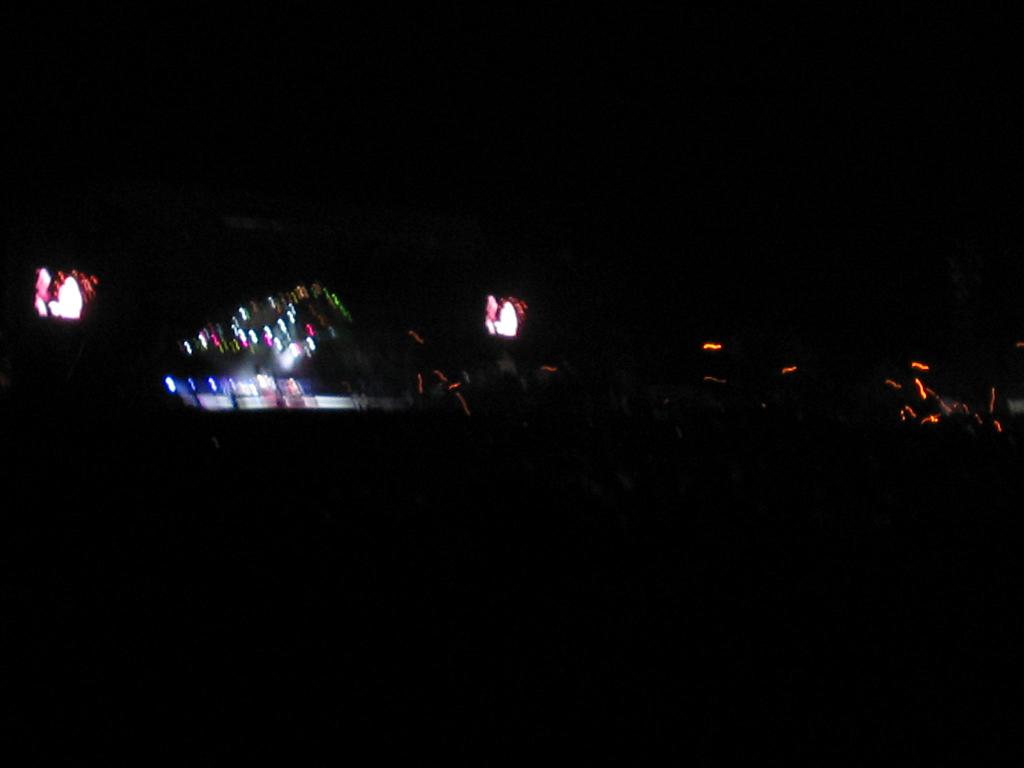 After the 3rd set, there was a "fabulous" fireworks display put on by the band, so they were beautiful, professional and a safe distace away. I really tried to get a picture, but the shutter always seemed to close between explosions. So I gave up and just enjoyed it. It was like Disneyland. After the encore, which probably held more meaning for real Phish fans who know about their history, tour buses visible from the crowd began to take off - we all assumed they had bailed as soon as possible to avoid any possible mayhem, since to get back to the camp grounds, we all had to cross the only service entrace/exit to the site. It was over. I felt it was anticlimactic, but I'd had a great day, the champagn was treating me fine and the thought of going home was very nice. Here's the set lists for the night