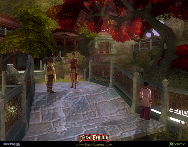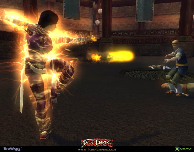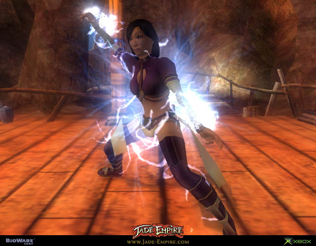 Aaron got a new game this week called Jade Empire (this site has sound). He played it for a little while, and then I thought I'd give it a try because it was my "Friday" evening. It's a pretty fucking awesome game. You can choose so many different paths, the fight skills are easy to learn but the game definitely keeps you on your toes, the stories and characters are engaging, the areas are complex and look great... and it's addictive. I started Thursday evening and just couldn't stop because I wanted to see what would happen next and what kind of crazy things would happen.